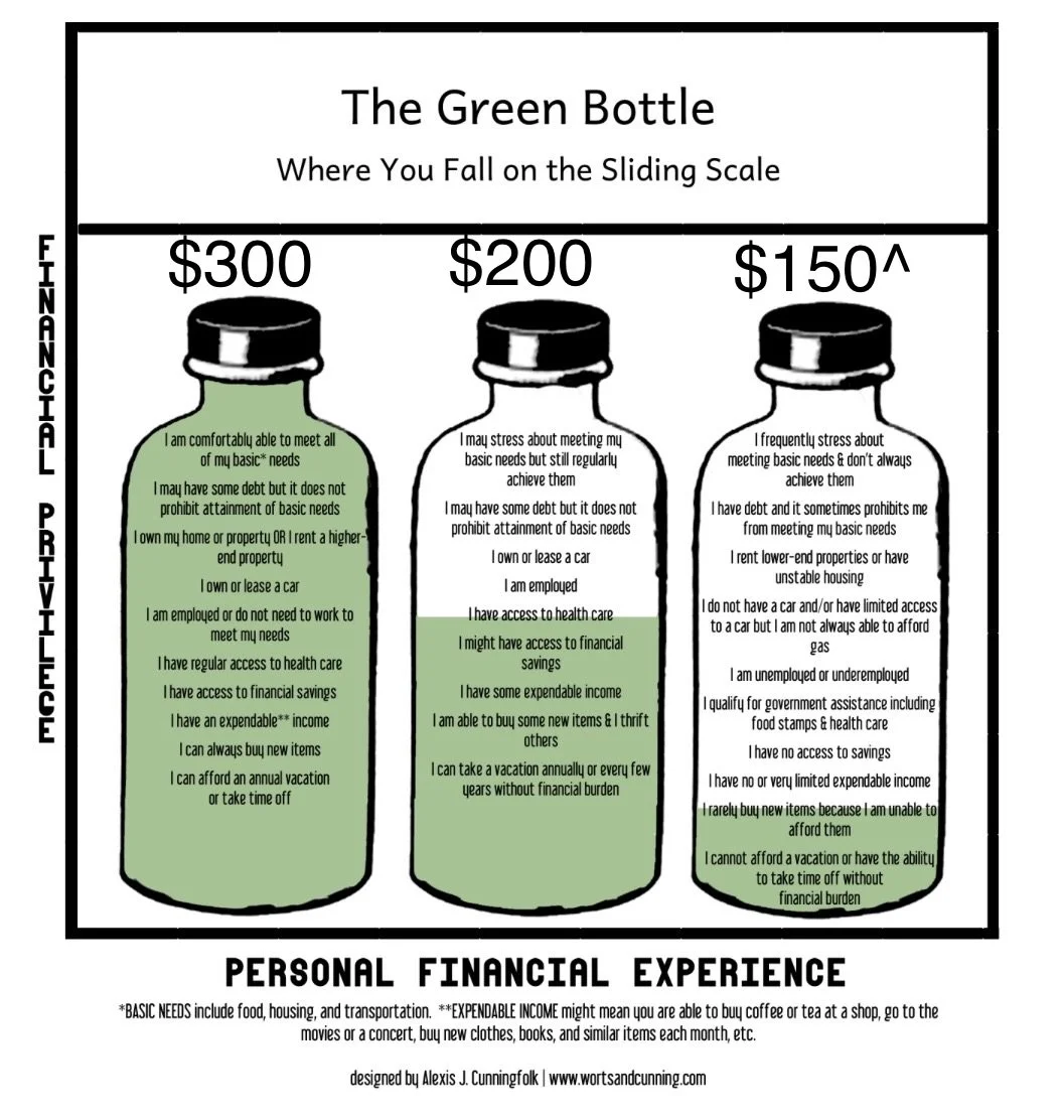 We use the Green Bottle Method to determine sliding scale pricing. This requires a combination of your participation and our trust. If you are between 2 categories, it’s okay to choose the lower cost option. See the graphic below for details (click image to see enlarged version). Please note that we can only accept a limited number of clients in each category. Contact us to schedule a brief call to discuss where you fall on the scale below and learn what the cost will be for you.